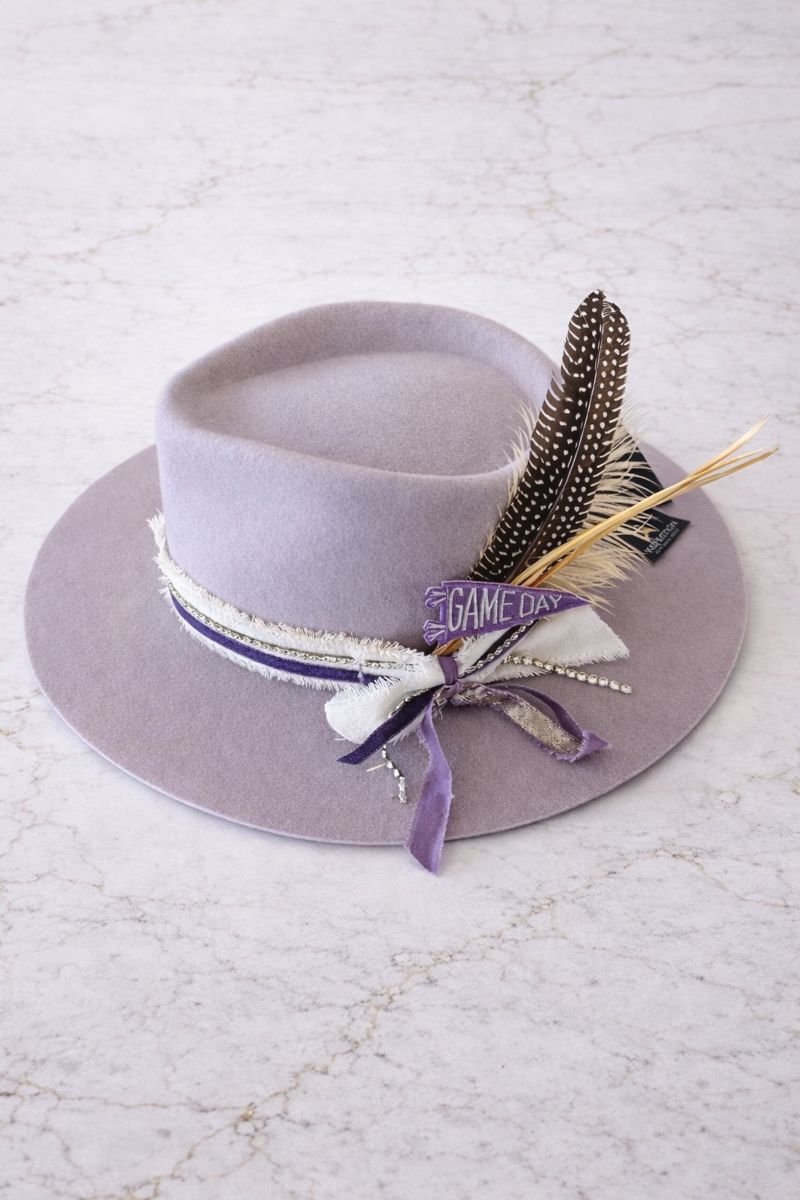 Lilac wool felt rancher pinch front hat styled with purple and white ribbons, “Game Day” patch, and feather accents by Swanky Doodle.